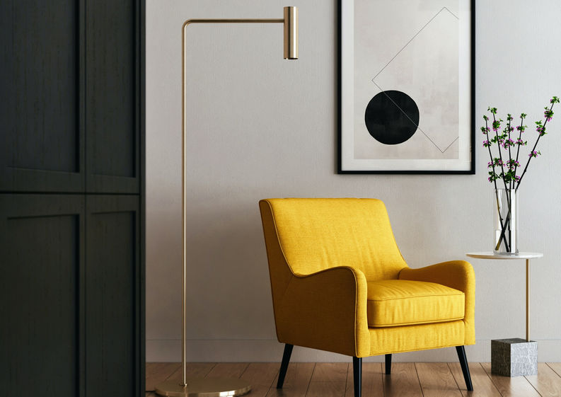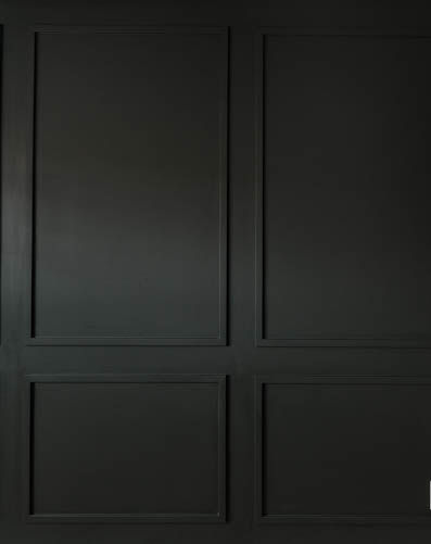 The chic black wall moulding adds drama while grounding the design. A pop of bold color is added with a plush yellow chair.